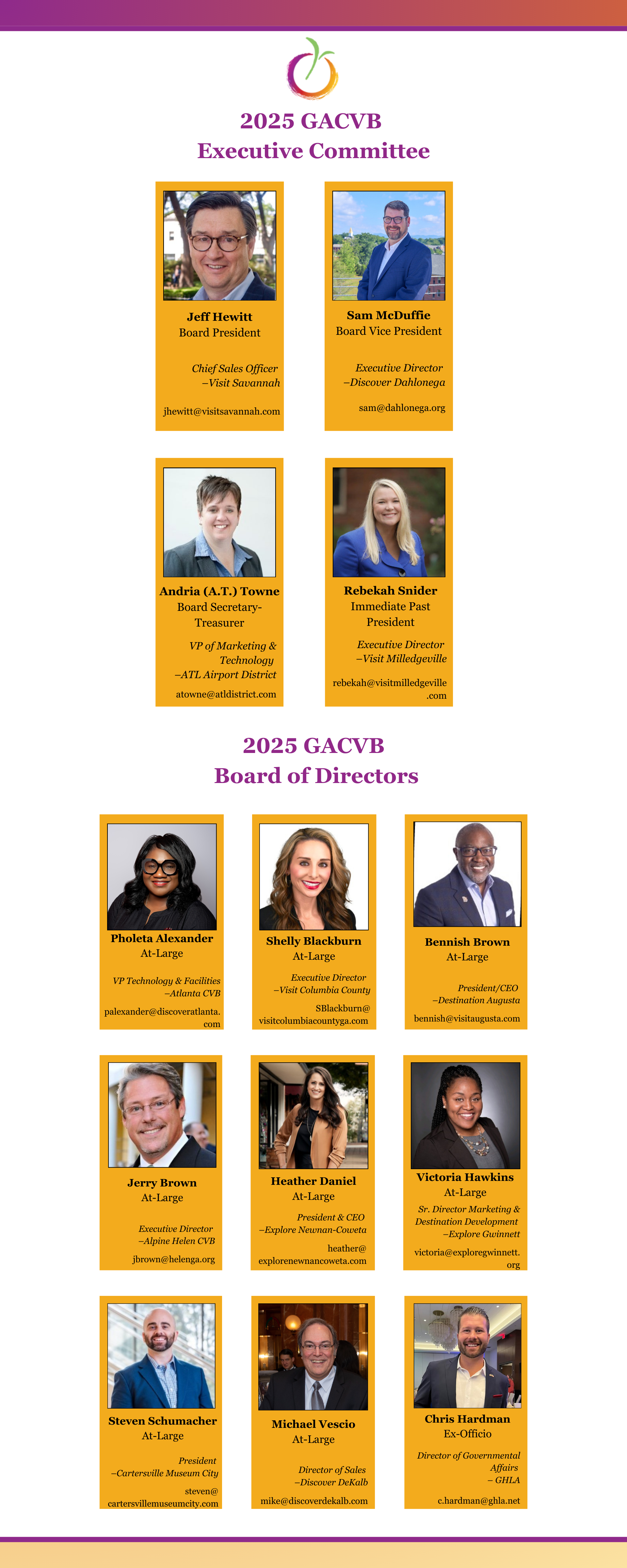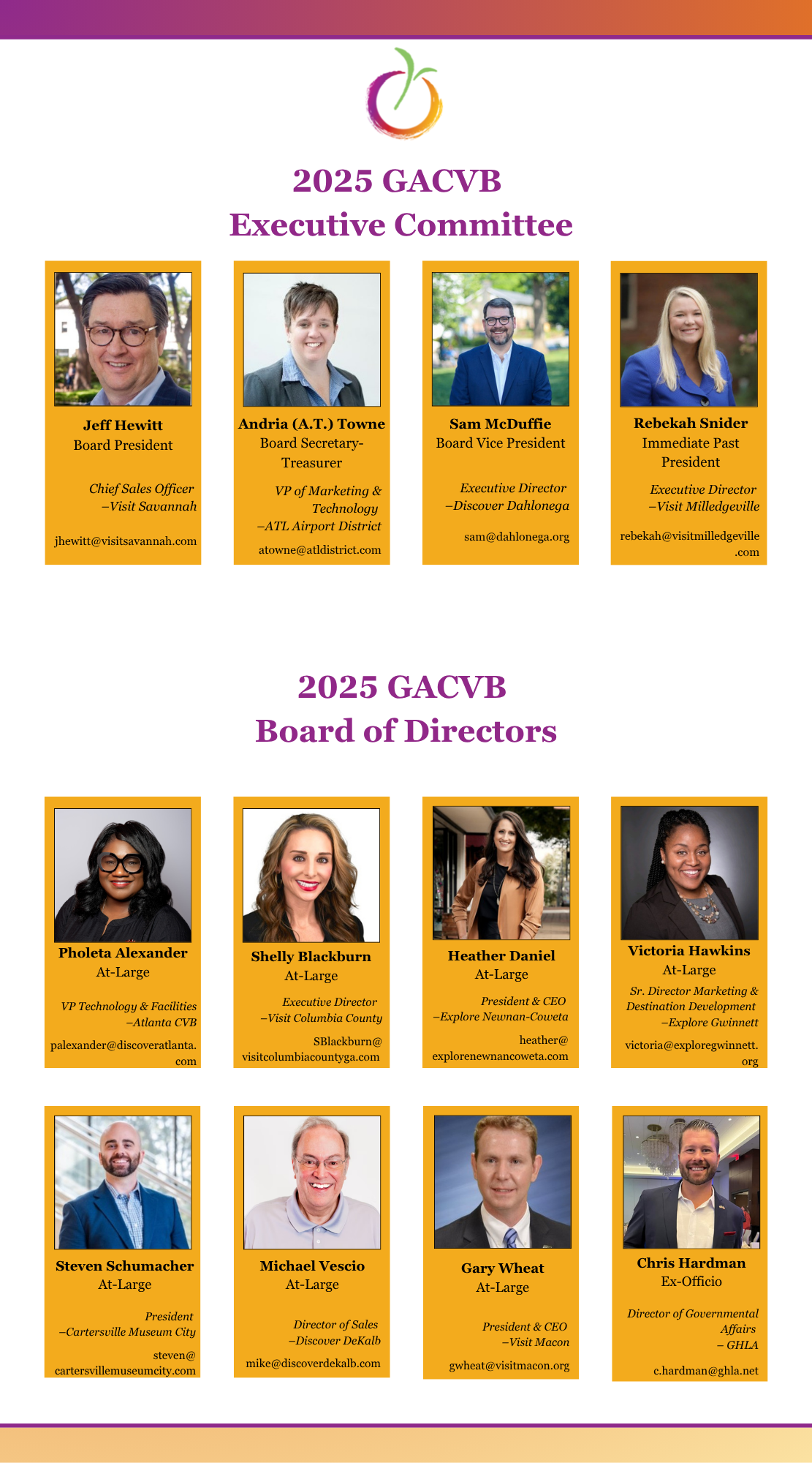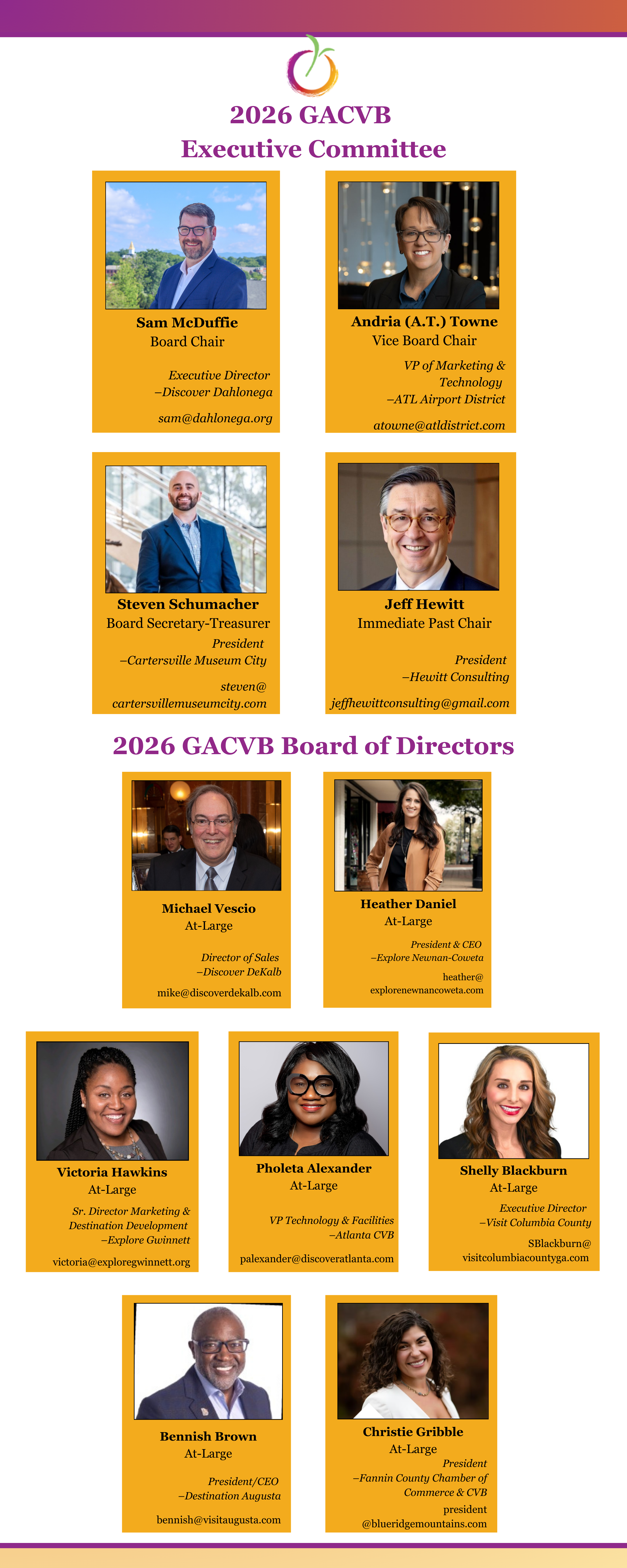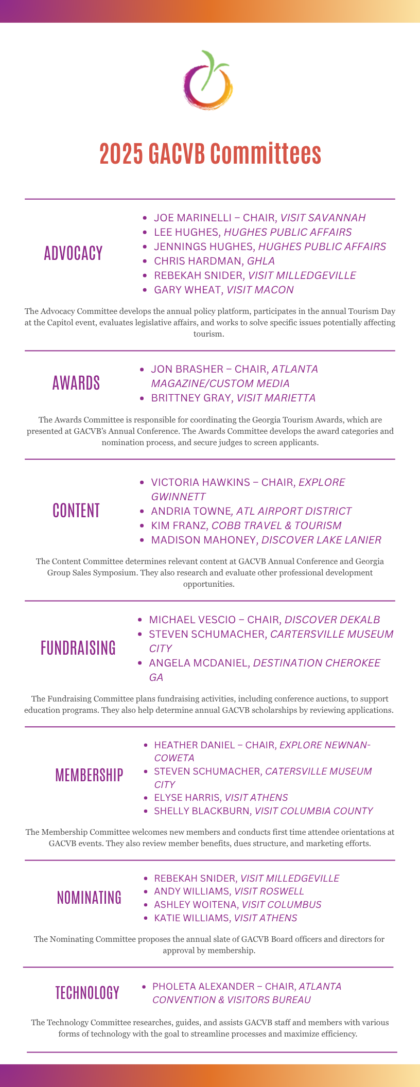 GACVB could not accomplish our goals without the help of our committees! Our members volunteer to serve on these committees, and are able to contribute by using their own skills, gifts, and expertise. We are always looking for volunteers! If you see a committee that interests you, feel free to reach out to the chair listed, or email us at [email protected] and we will be happy to connect you! |